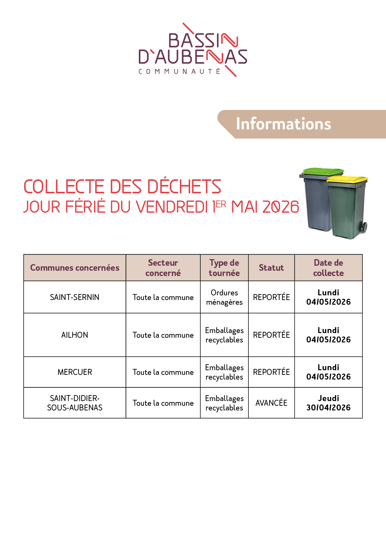 • Ailhon et Mercuer : la collecte des déchets recyclables sera reportée au lundi 4 mai 2026 ;