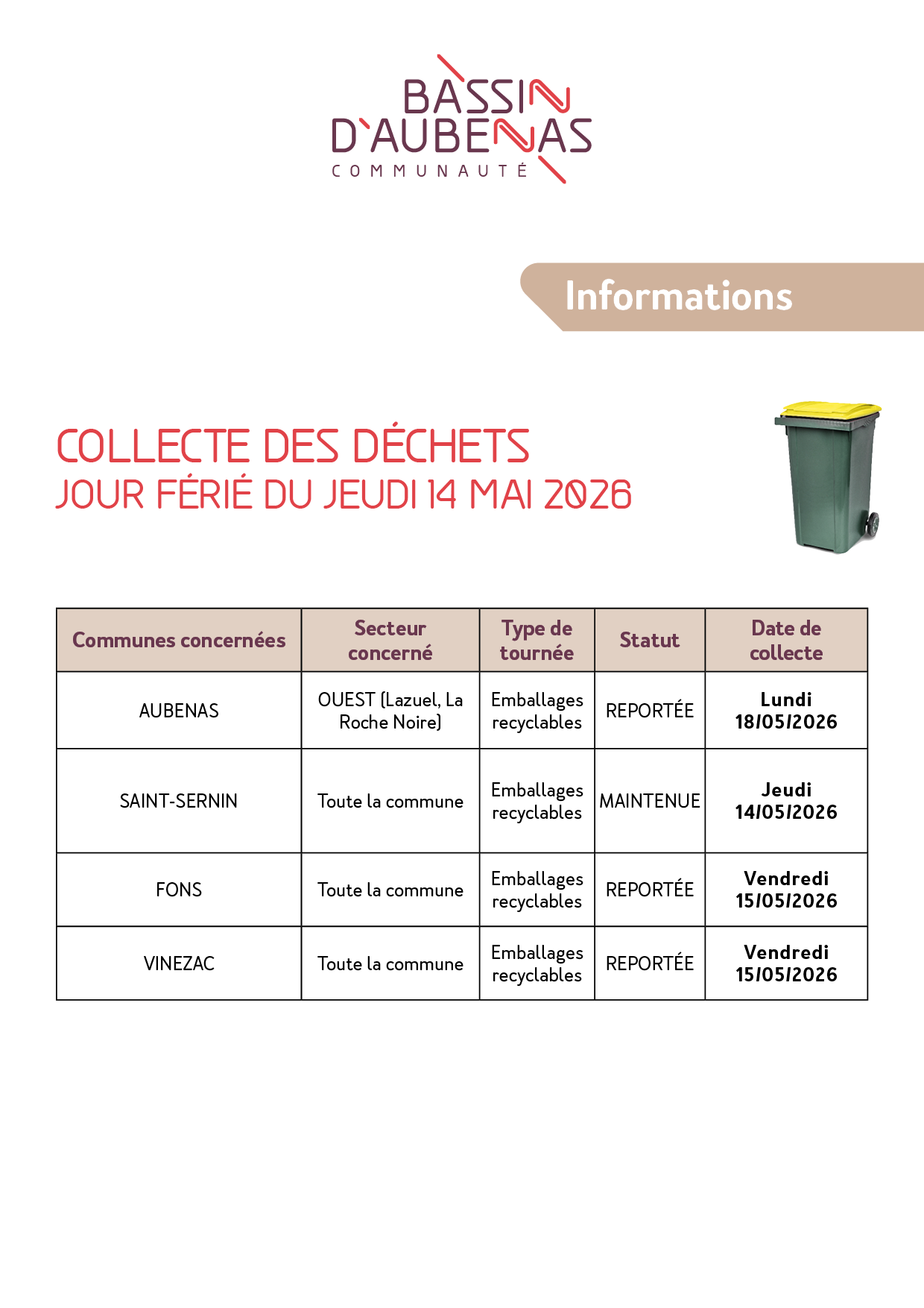 • Saint-Sernin : la collecte des déchets recyclables sera maintenue le jeudi 14 mai 2026.