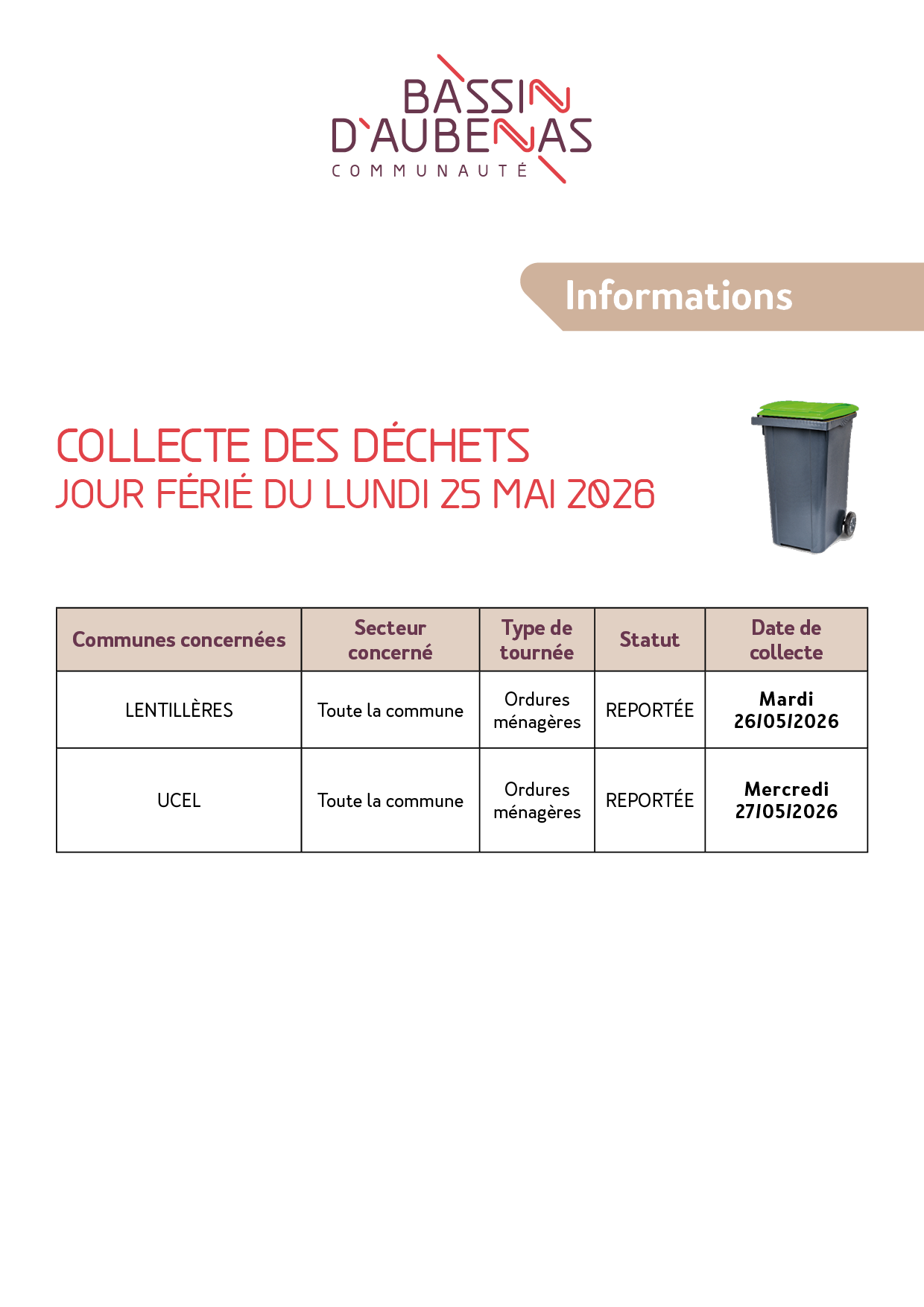 • Aubenas (ZI Roqua) et Pont d’Aubenas (Quartier Dugradus) : la collecte des déchets recyclables sera reportée au lundi 11 mai 2026.